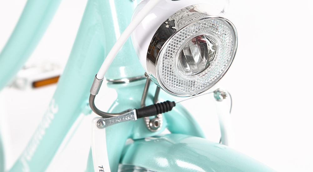 - Każdy rower już w standardzie otrzymuje pełne wyposażenie takie jak mocne oświetlenie przednie LED (spełniające niemieckie wyśrubowane standardy, siła światła 25 lux, 2 poziomy świecenia) i tylne także LED, stopkę a nawet podręczny klucz rowerowy.